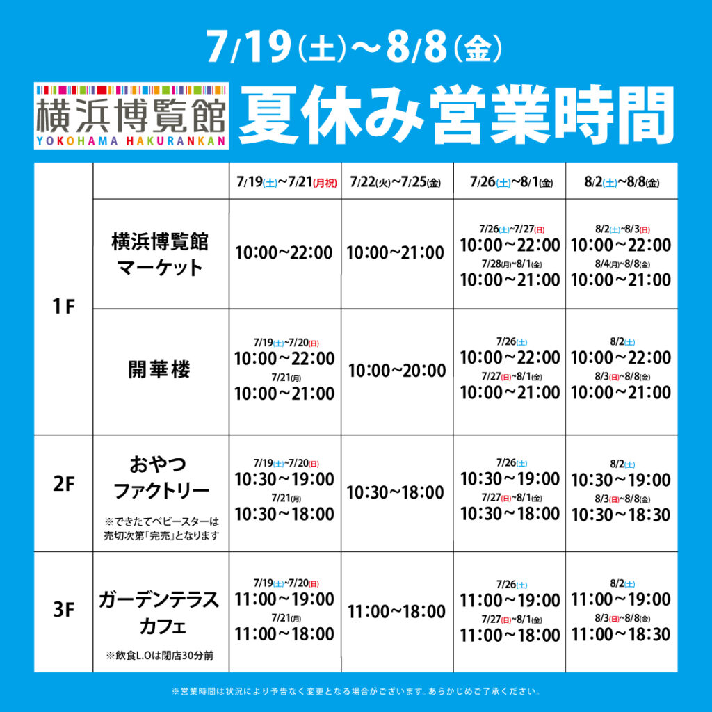 夏休み期間の営業時間は「通常営業時間」と異なりますのであらかじめご了承ください。