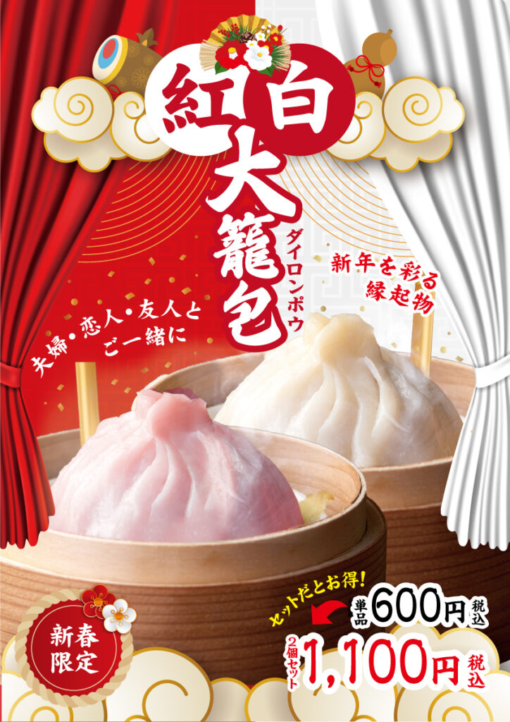 また、縁起の良い紅白バージョンの大籠包も同時販売ご夫婦・恋人・ご友人と楽しめる、お得なセット価格もご用意いたします。